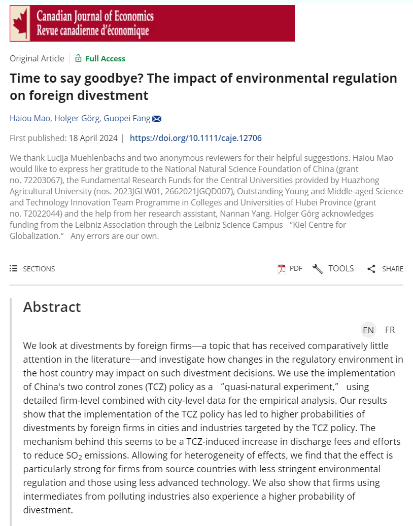 近日,威尼斯官网毛海欧副教授与德国基尔世界经济研究所Holger Görg教授、华中科技大学经济学院方国培博士在经济学类权威期刊Canadian Journal of Economics发表题为“Time to Say Goodbye? The Impact of Environmental Regulation on Foreign Divestment”的论文。该研究得到国家自然科学基金(72203067)、9499www威尼斯自主科技创新基金(2662021JGQD007)、9499www威尼斯高水平论文培育项目(2023JGLW01)、湖北省高等学校优秀中青年科技创新团队“农业产业与技术经济”(T2022044)的资助。Canadian Journal of Economics由加拿大经济学会主办,在国际经济学界享有较高声誉和广泛认可度,是国际贸易领域公认的Field Top期刊,这也是学院近年来在国际主流经济学期刊上取得的重要突破。